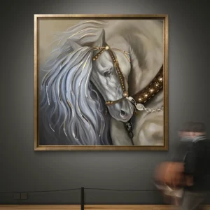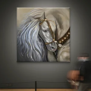 Un tableau raffiné représentant un majestueux cheval blanc orné de détails dorés et d’un harnais élégant. La douceur de ses