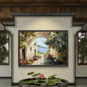 Un tableau artistique éclatant qui capture la beauté d’un passage méditerranéen fleuri, ouvert sur une vue apaisante de la mer.