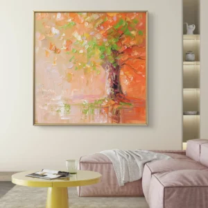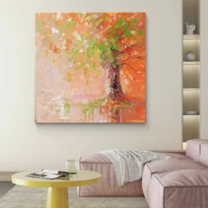 Un arbre majestueux peint à larges coups de pinceau, mêlant des teintes chaudes d’orange et de rose, contrastées par des