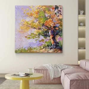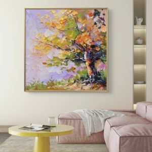 Un chef-d’œuvre coloré qui capture la beauté vibrante d’un arbre en automne. Les touches épaisses et dynamiques de peinture créent
