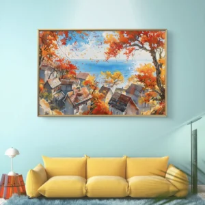 Plongez dans la douceur d’un village pittoresque niché au bord de la mer, entouré de couleurs chaudes d’automne et caressé
