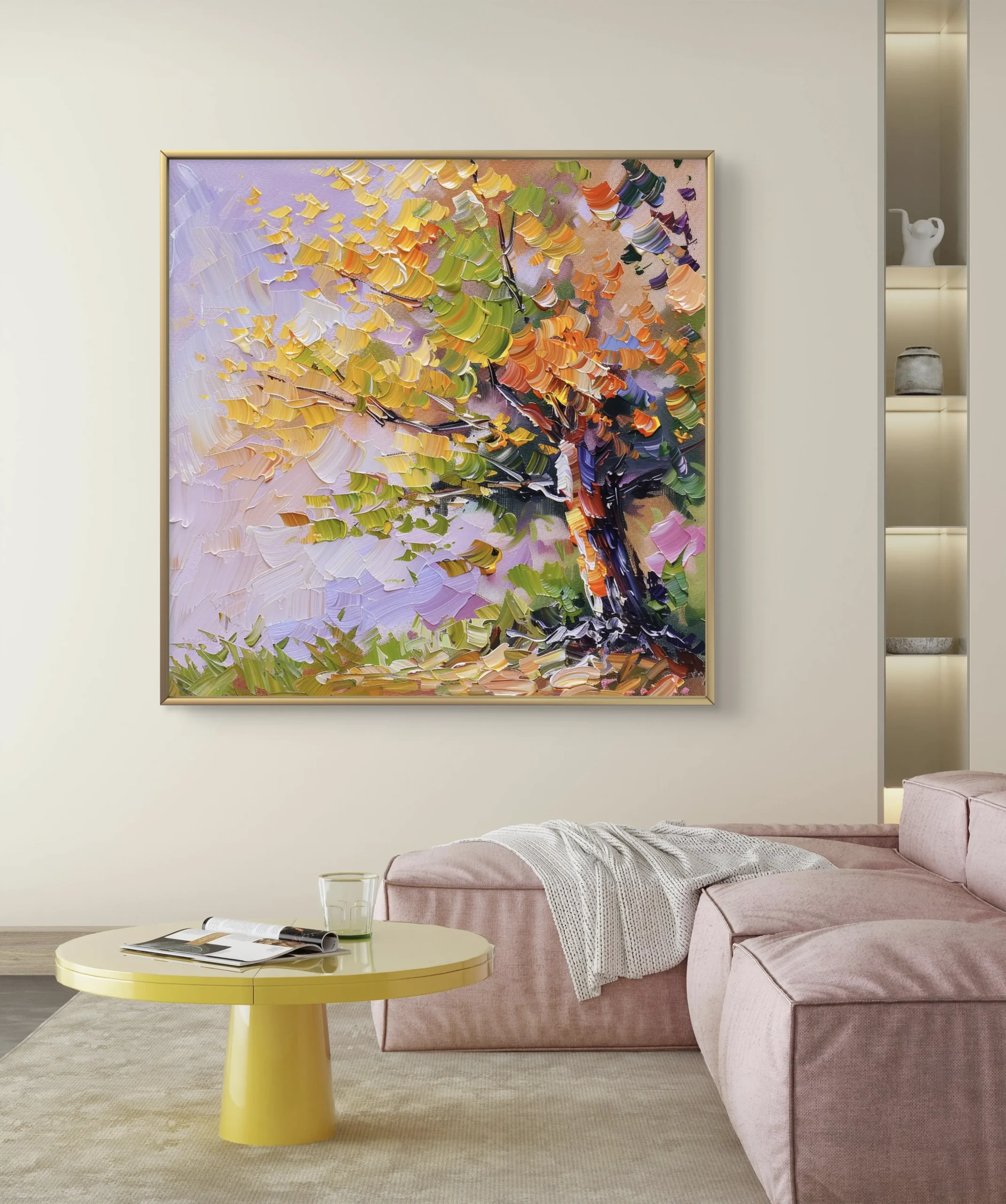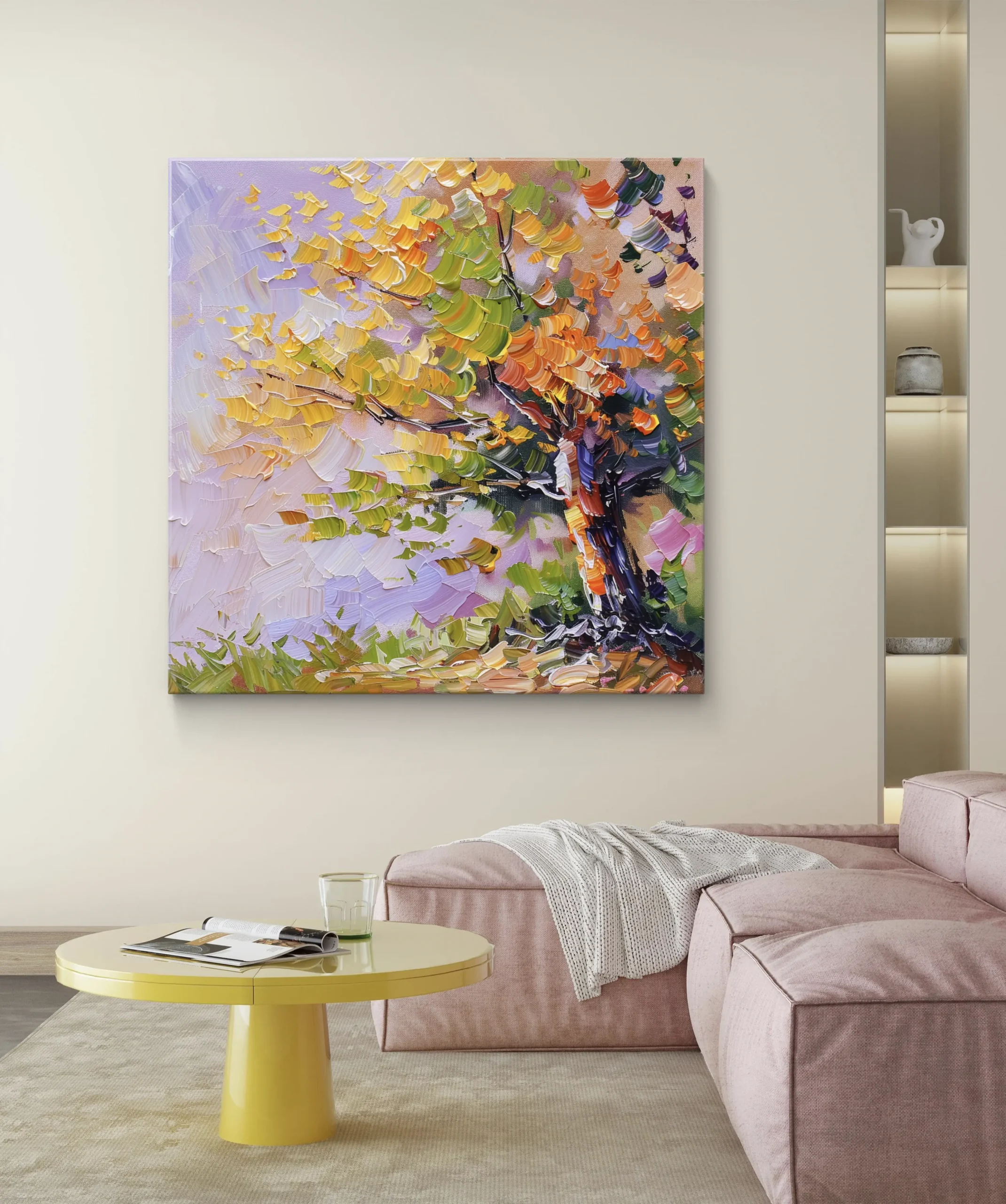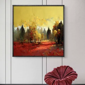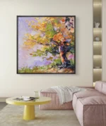 Un chef-d’œuvre coloré qui capture la beauté vibrante d’un arbre en automne. Les touches épaisses et dynamiques de peinture créent une texture vivante et chaleureuse, apportant une atmosphère artistique et joyeuse à votre espace intérieur.