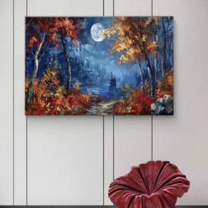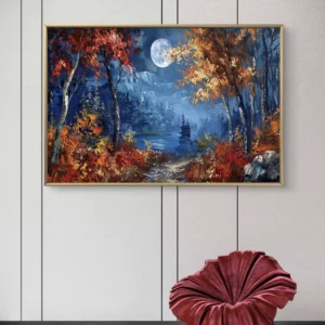 Un sentier mystérieux sous la lumière d’une pleine lune éclaire une forêt flamboyante aux couleurs d’automne. Cette œuvre évoque la