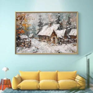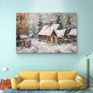 Tableau décoratif représentant un paisible chalet enneigé entouré de sapins et d’un paysage hivernal. Les touches de peinture texturées et