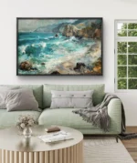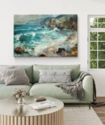 Évadez-vous au cœur d’un paysage côtier où les vagues turquoise viennent caresser une plage sauvage bordée de falaises majestueuses. Cette toile lumineuse capture la fraîcheur et la vitalité de l’océan, invitant la nature et l’évasion dans votre espace de vie.