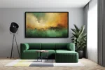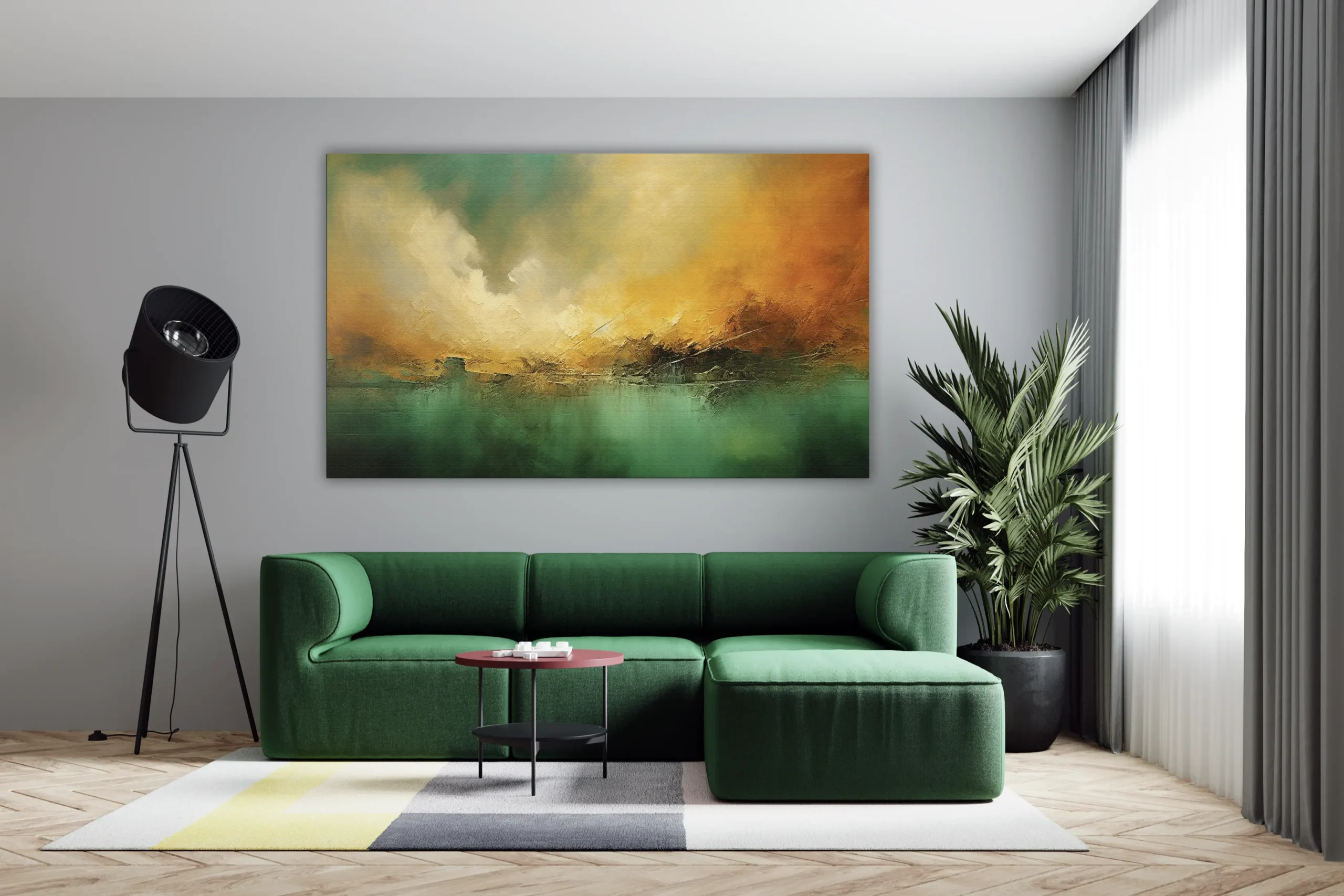 Une toile abstraite apaisante mêlant des tons chauds d’orange doré à des nuances profondes de vert émeraude. L’effet vaporeux et fluide évoque un lever de soleil à travers la brume, créant une atmosphère douce et mystérieuse. Un choix parfait pour ajouter de la chaleur et de l’élégance à votre intérieur.