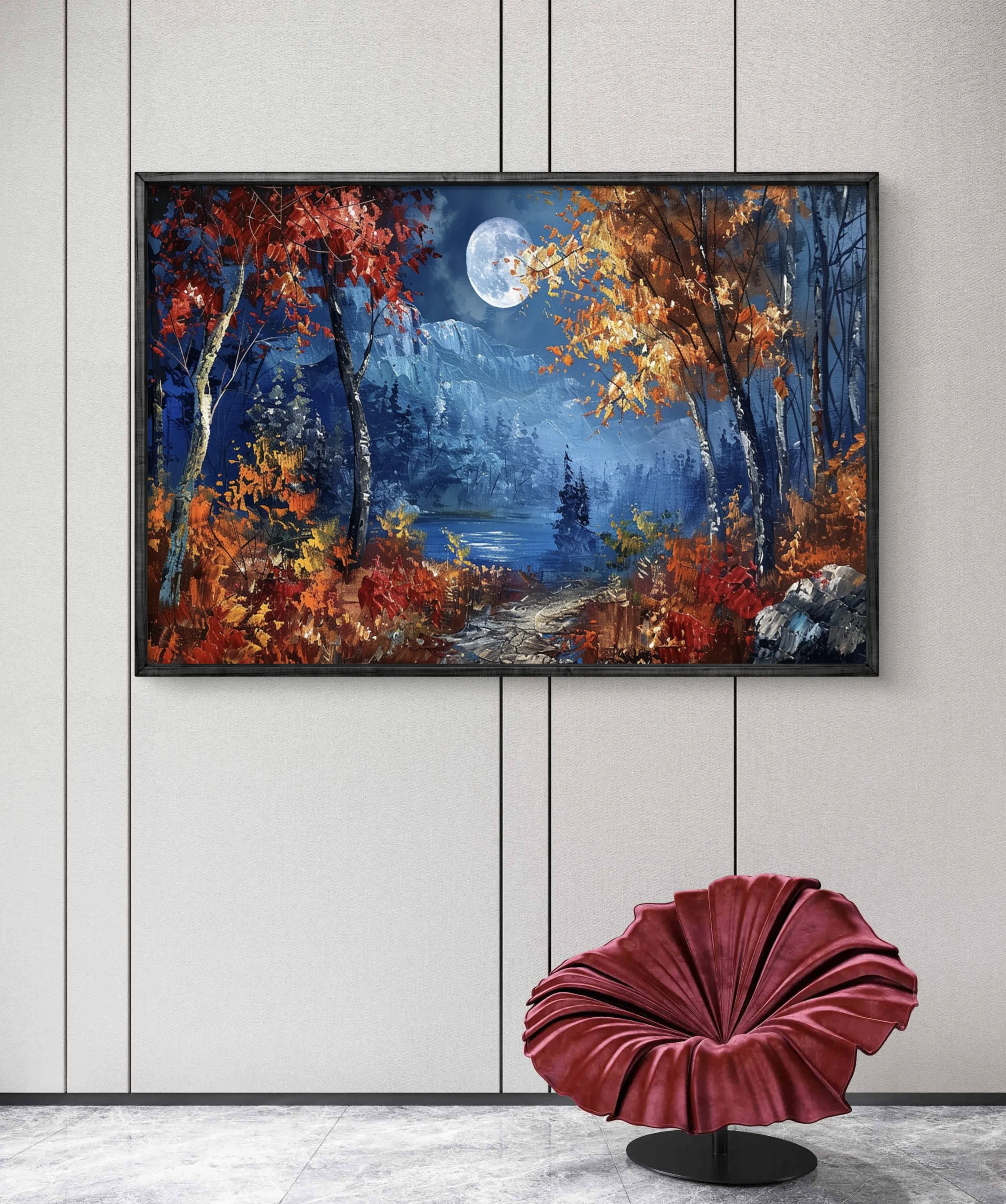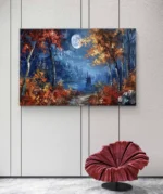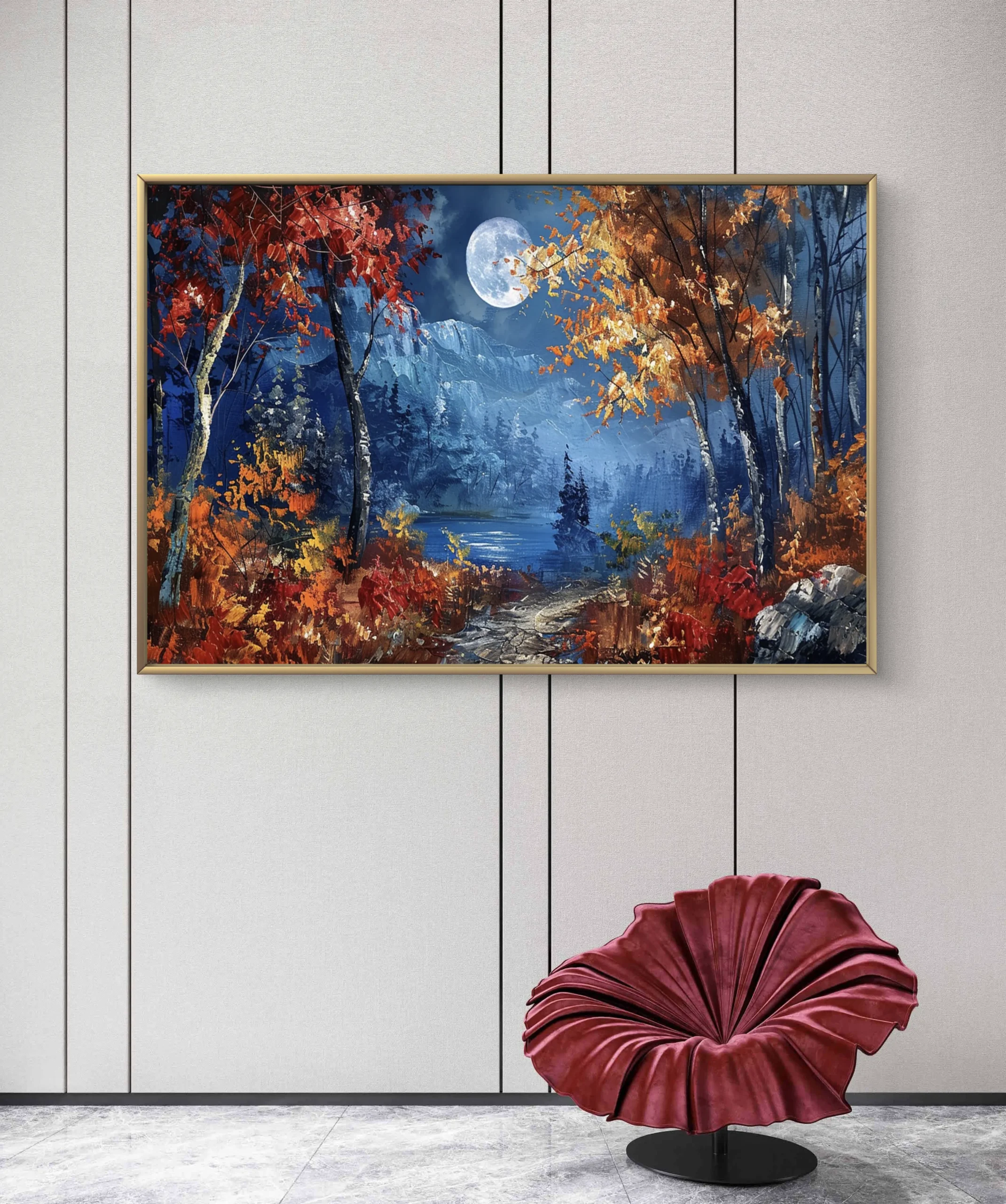 Un sentier mystérieux sous la lumière d’une pleine lune éclaire une forêt flamboyante aux couleurs d’automne. Cette œuvre évoque la magie et la poésie des nuits d’automne, apportant élégance et profondeur à votre décoration intérieure.