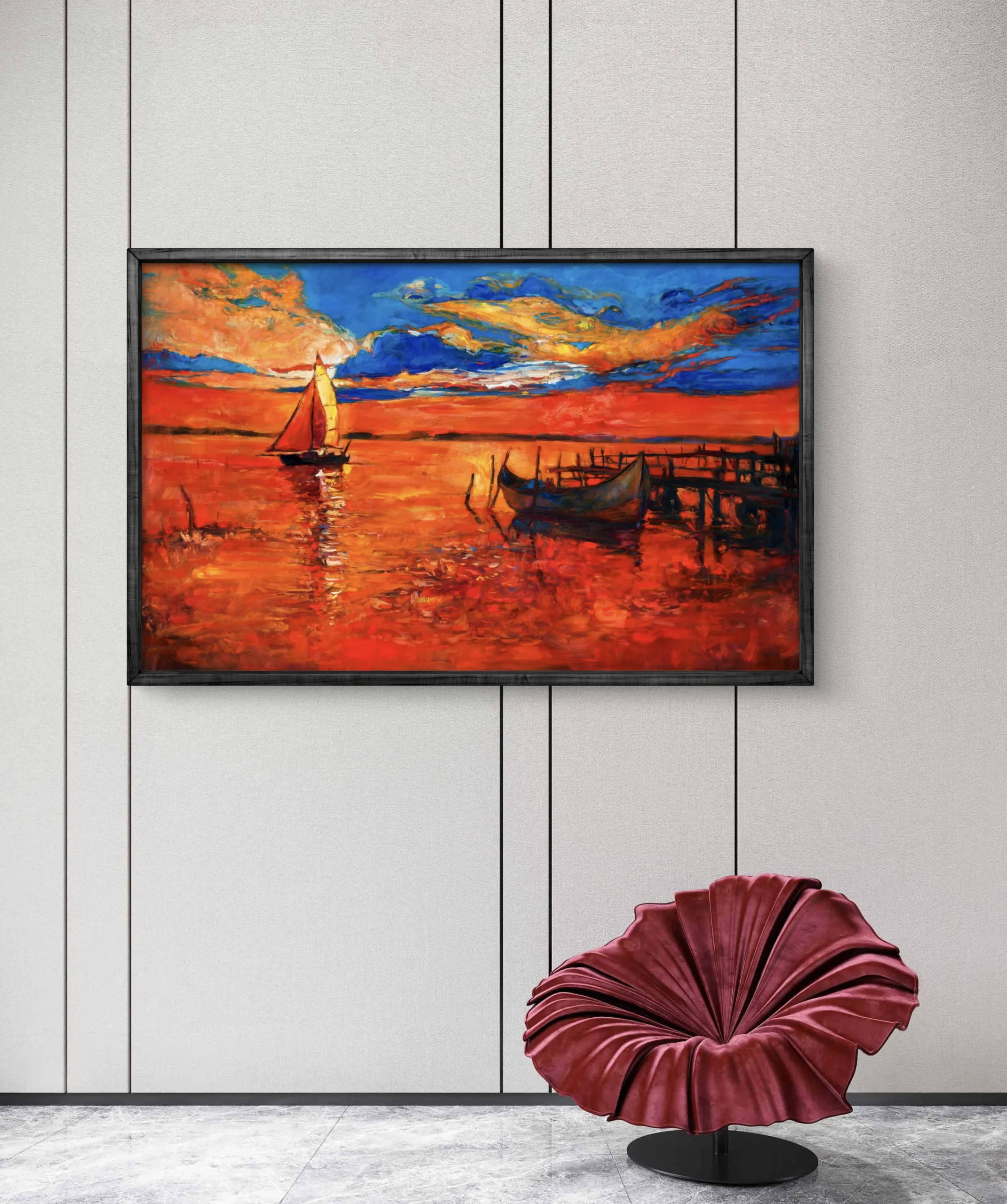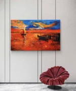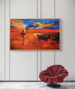 Plongez dans la magie d’un coucher de soleil flamboyant avec Crépuscule en Feu, une œuvre vibrante aux couleurs intenses. Cette peinture capture un voilier solitaire naviguant sur une mer embrasée, tandis que le ciel s’embrase de nuances rougeoyantes, orange et bleues. Un vieux quai et des barques silencieuses complètent la scène, évoquant à la fois la sérénité et la puissance de la nature. Un chef-d’œuvre idéal pour illuminer un intérieur moderne avec une touche de poésie et de chaleur.