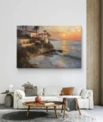 “Crépuscule sur la Côte” est une peinture à l’huile empreinte de chaleur et de douceur, illustrant un coucher de soleil doré sur une maison méditerranéenne perchée au bord d’une falaise. Les tons chauds de l’orange, du rose et de l’or se reflètent délicatement sur la mer calme, tandis que les silhouettes de palmiers ajoutent une touche d’exotisme et de sérénité à la scène.