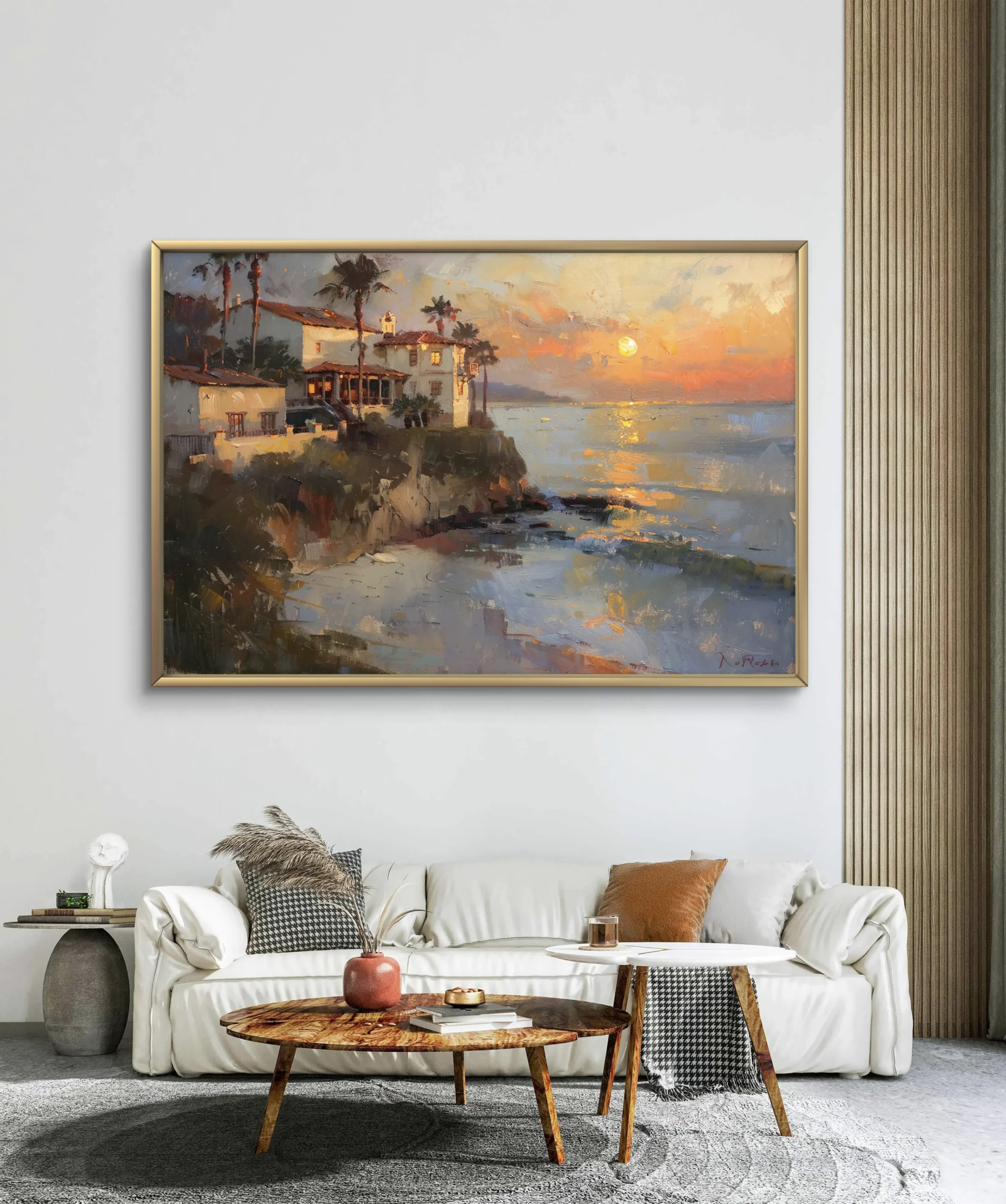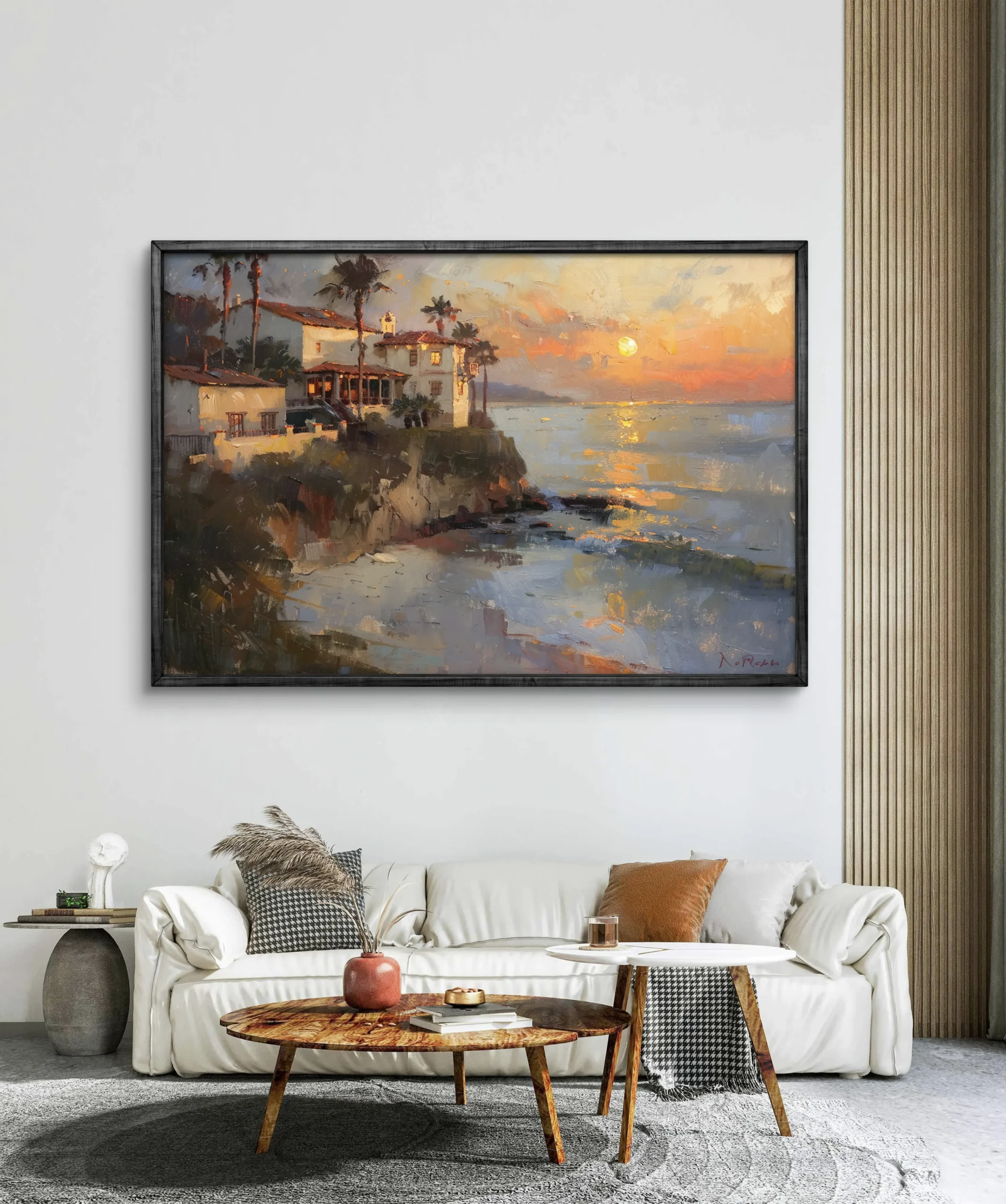 Cette œuvre évoque les soirées paisibles en bord de mer, et transforme n’importe quel intérieur en un coin d’évasion lumineuse et apaisante.