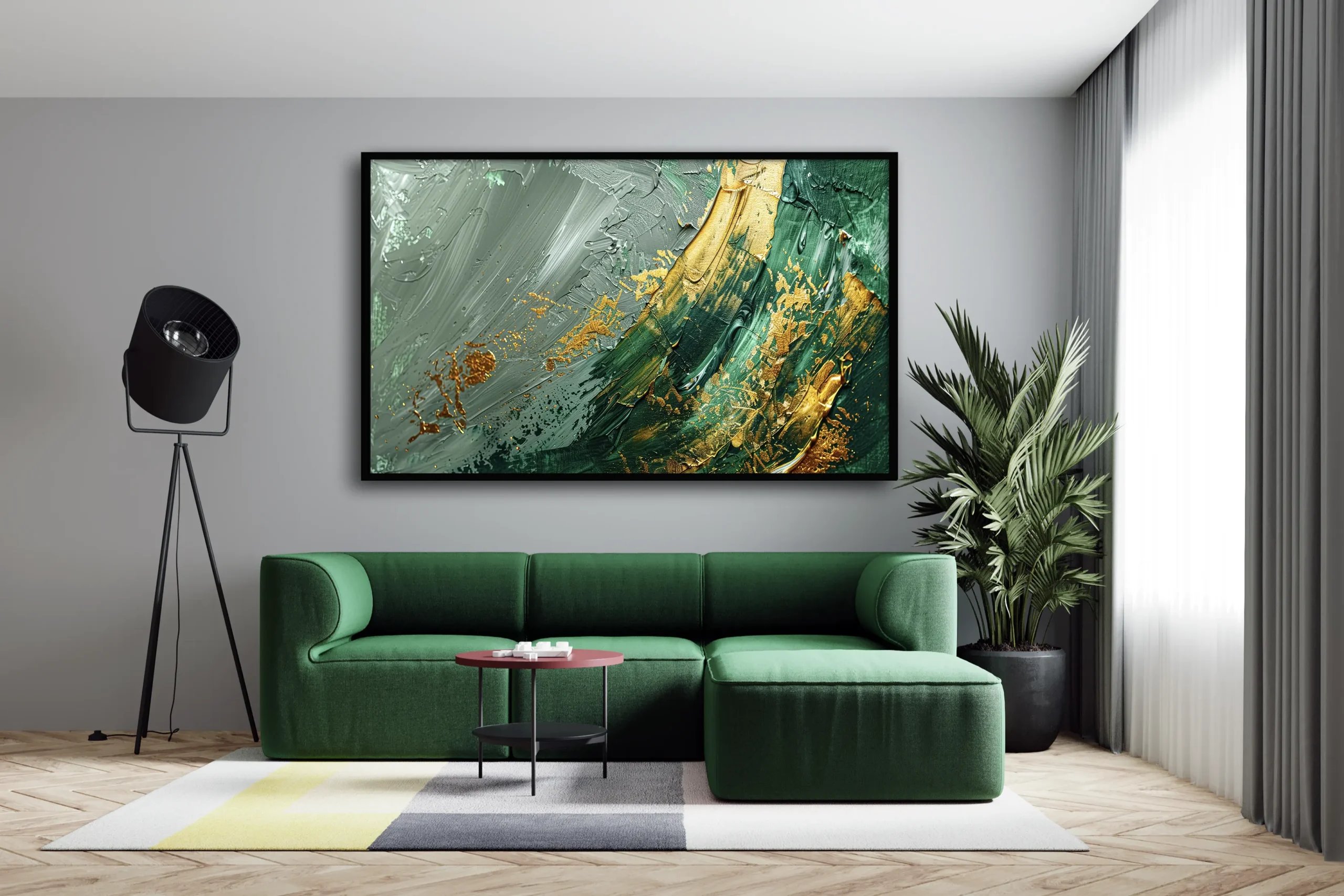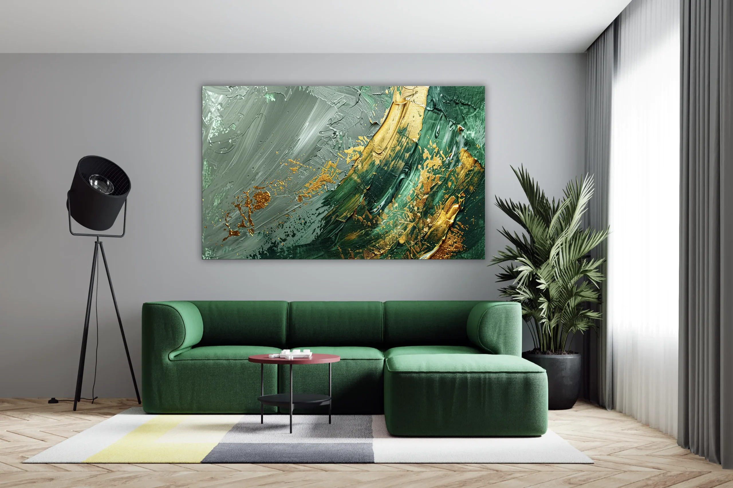 Une œuvre abstraite vibrante mêlant des teintes profondes de vert émeraude, des touches dorées métalliques et des nuances de gris texturé. Chaque coup de pinceau énergique évoque la puissance de la nature et le mouvement fluide de la matière. Ce tableau apporte élégance et intensité à tout espace intérieur.