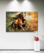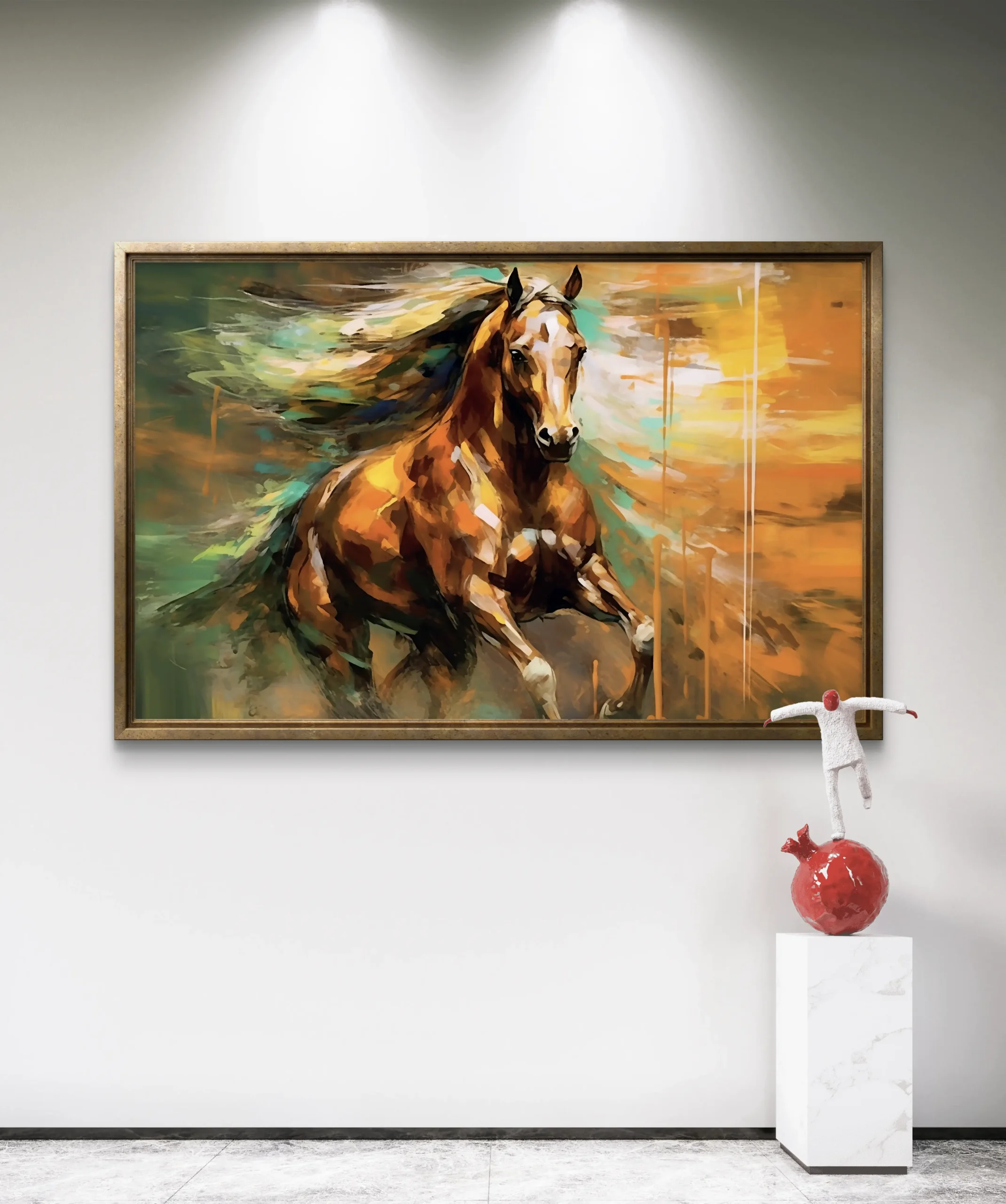 Plongez dans la puissance et la liberté avec Élan Sauvage, une œuvre d’art vibrante représentant un cheval majestueux lancé à pleine vitesse. Ce tableau mêle des tons chauds d’orange et d’ocre à des éclats de vert et de brun, créant une sensation de mouvement et d’intensité. Parfait pour sublimer un intérieur moderne, il évoque à la fois la force, la grâce et l’esprit indomptable de la nature.