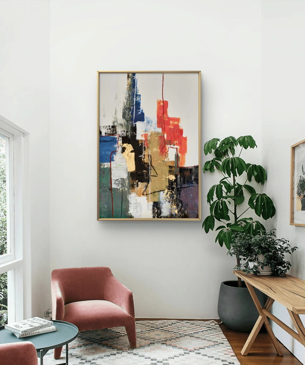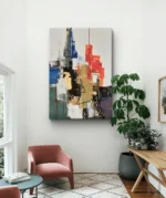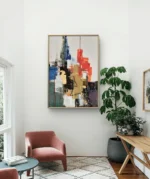 Laissez-vous emporter par la puissance d’Énergie Urbaine, une œuvre abstraite moderne où les tons chauds du rouge et de l’or se mêlent aux nuances profondes du bleu et du noir. Ce tableau évoque la vitalité des grandes villes, la créativité et le mouvement constant. Parfait pour apporter une touche contemporaine et dynamique à votre intérieur.