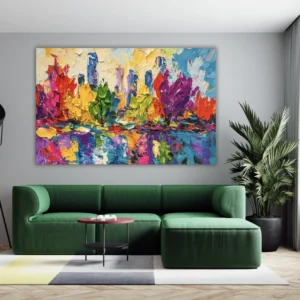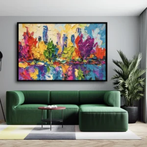 Un tableau éclatant qui capture l’énergie vibrante d’une ville moderne à travers une explosion de couleurs vives et de textures