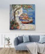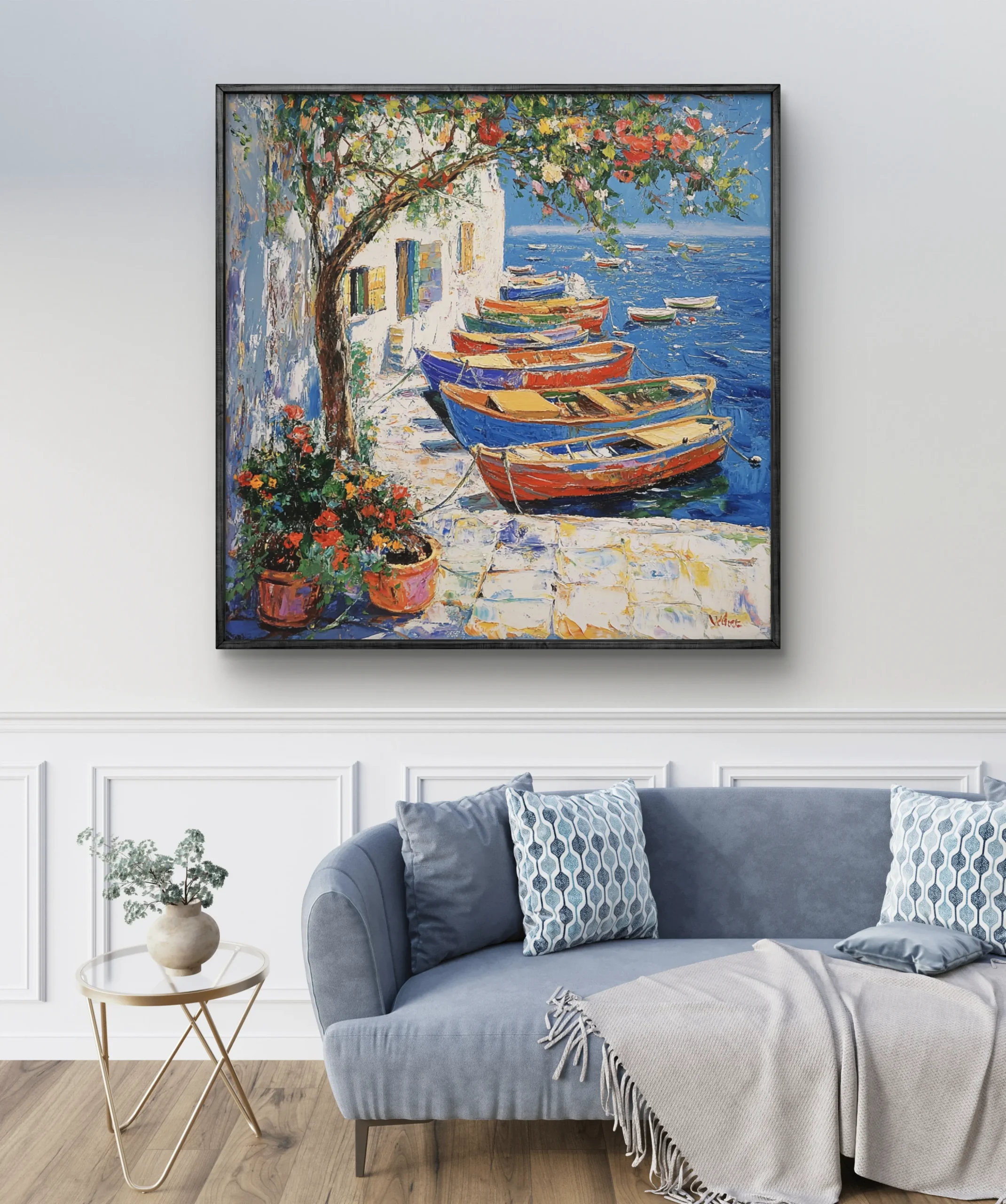Plongez dans l’atmosphère ensoleillée d’un village méditerranéen avec ce tableau vibrant et texturé. Des barques colorées reposent paisiblement sur le quai, bercées par une mer bleu profond. À l’ombre d’un arbre fleuri et à côté de pots de fleurs éclatants, cette œuvre dégage un sentiment de calme, de chaleur et d’évasion. Un mélange harmonieux de couleurs et de lumière qui apporte une touche de fraîcheur et de charme à tout intérieur.