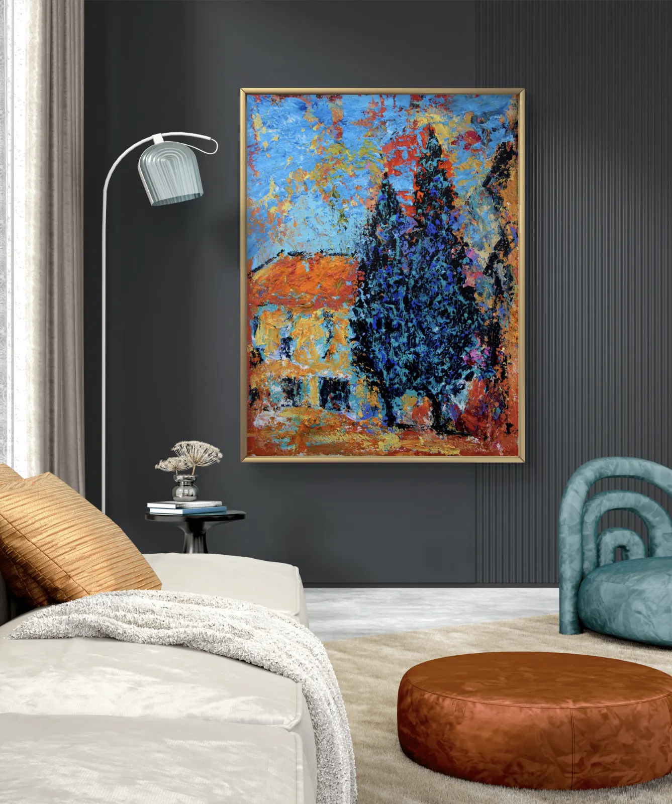 Ce tableau vibrant et texturé capture l’essence d’un village méditerranéen baigné de lumière. Les couleurs intenses — bleu, orange, rouge et noir — s’entrechoquent pour créer une scène pleine de vie. Les deux grands cyprès noirs dominent la composition, évoquant le calme et la force, tandis que les toits rouges et le ciel éclatant rappellent la chaleur du sud.