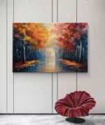 “Passage d’Automne” est une peinture à l’huile vibrante et immersive qui transporte le spectateur au cœur d’une forêt enchantée. Les arbres aux feuillages rougeoyants et dorés forment une allée lumineuse, menant vers une arche mystérieuse baignée de lumière. Le sol mouillé reflète les couleurs chaudes des feuilles d’automne, créant un jeu de reflets féérique.