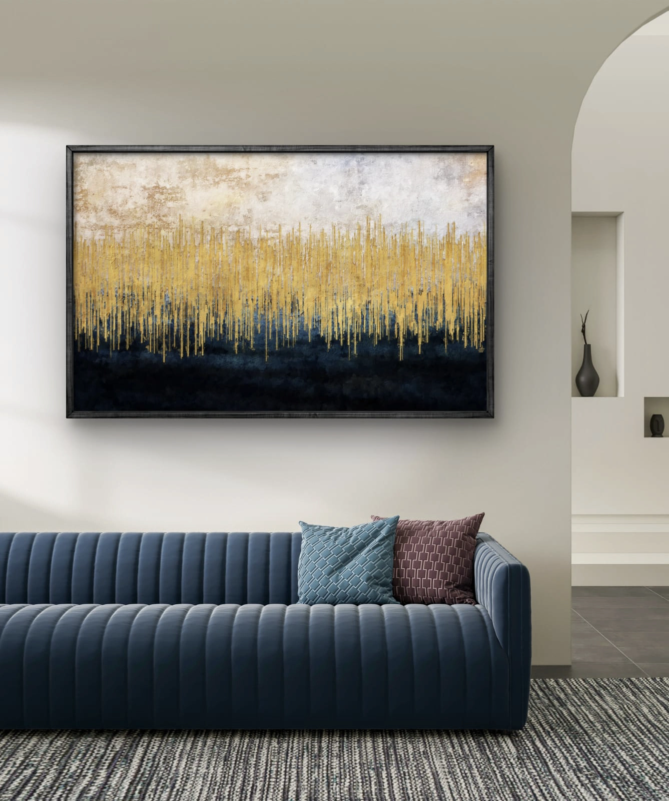 Ce tableau incarne la rencontre entre luxe et sobriété, apportant une touche artistique moderne et lumineuse à tout espace intérieur. Il s’intègre parfaitement dans un salon, une entrée ou un bureau contemporain.