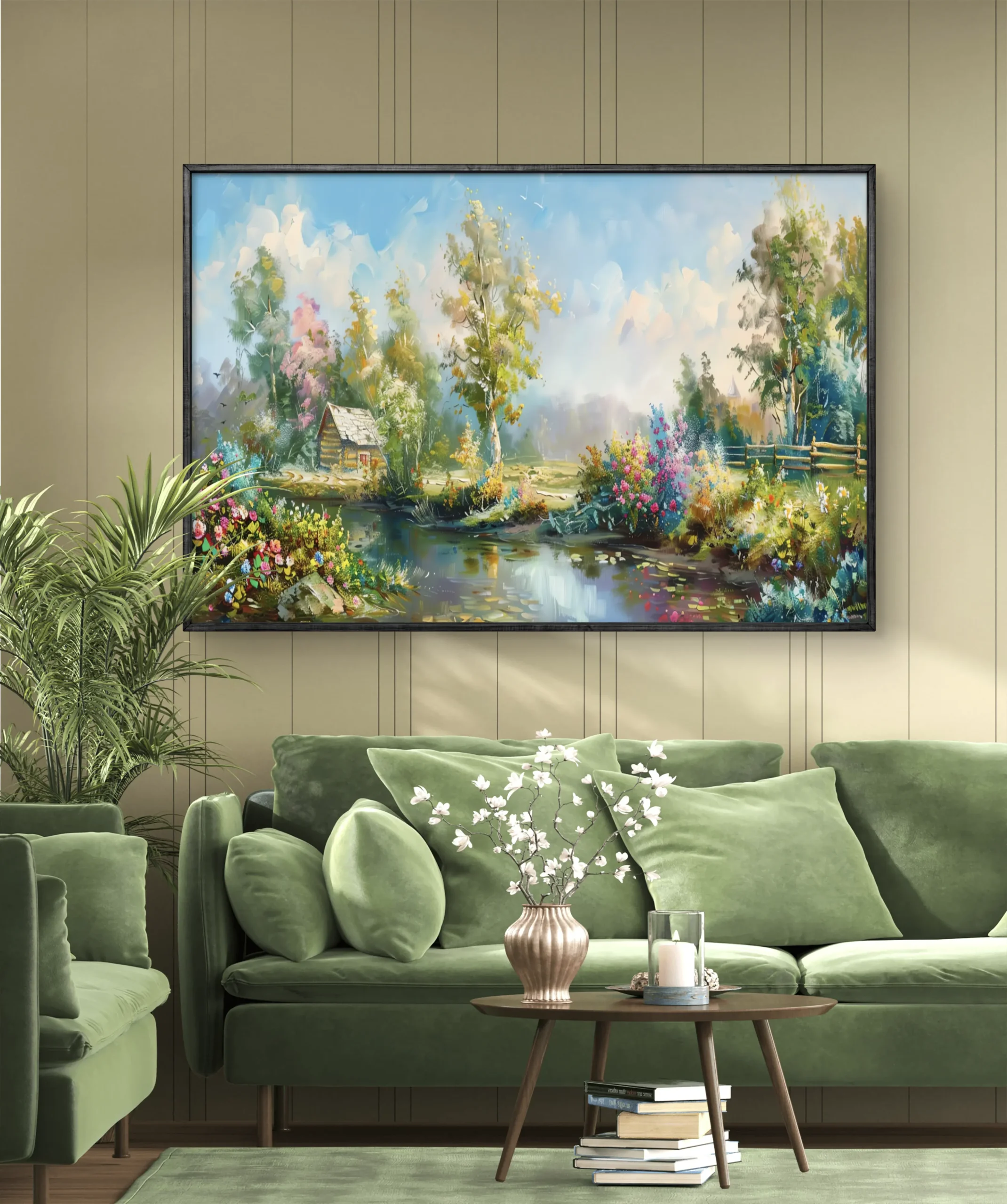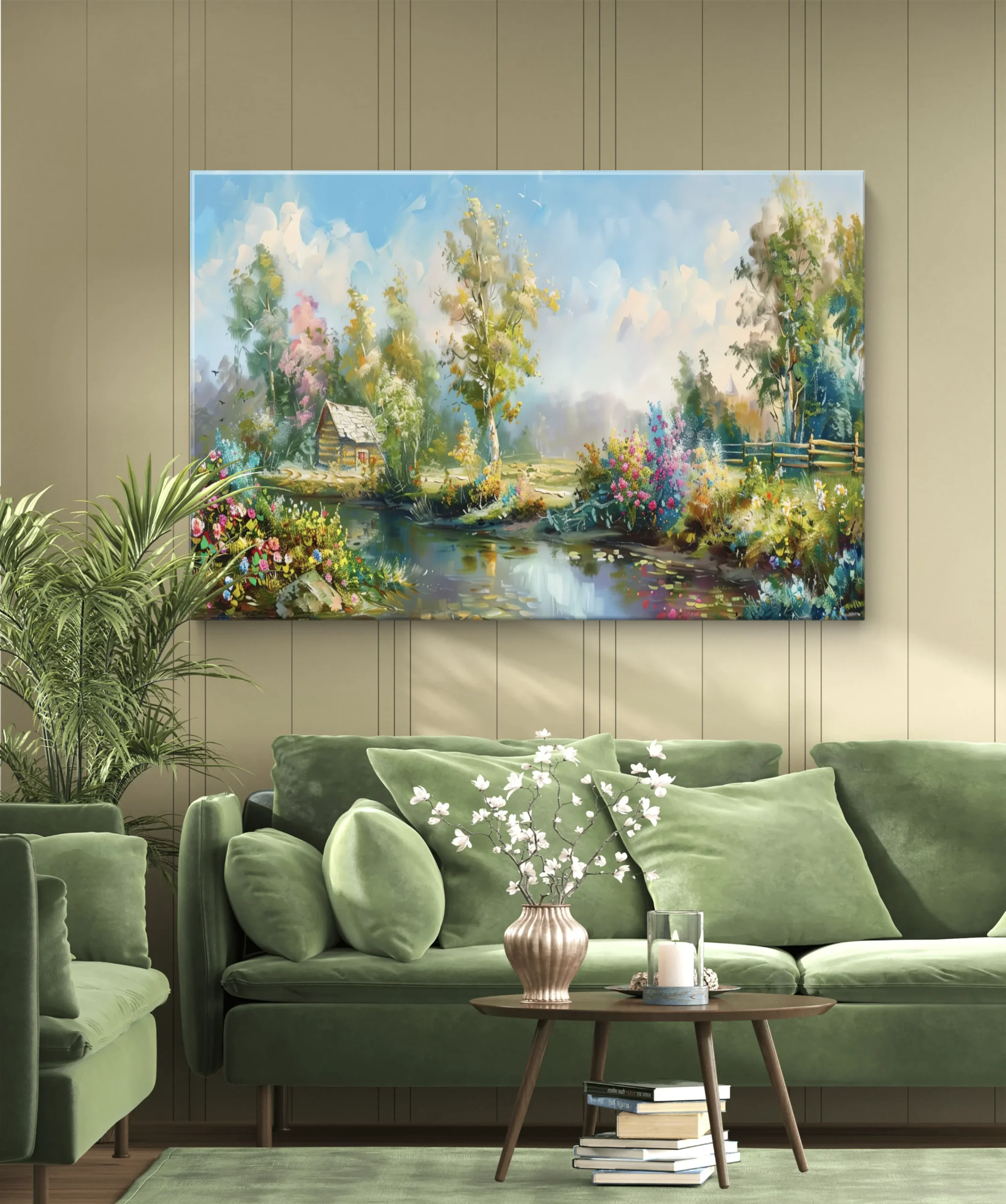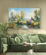 Cette œuvre poétique nous transporte dans un coin de nature paisible, baigné par une lumière douce du matin. Un petit chalet en bois niché parmi les arbres, des fleurs éclatantes, un ciel lumineux et un lac calme qui reflète toute cette beauté naturelle. L’artiste capture ici un instant suspendu, un moment de sérénité où le temps semble s’arrêter. Une toile idéale pour instaurer une ambiance chaleureuse et apaisante dans votre intérieur.