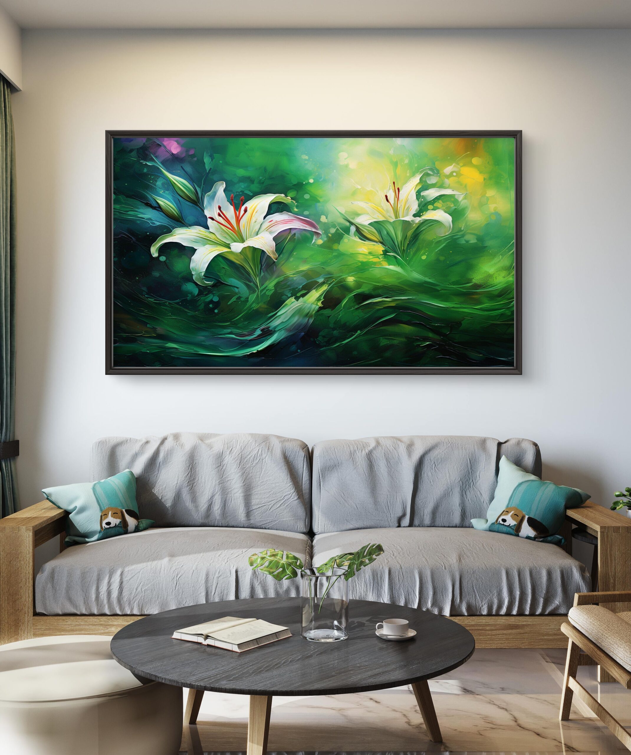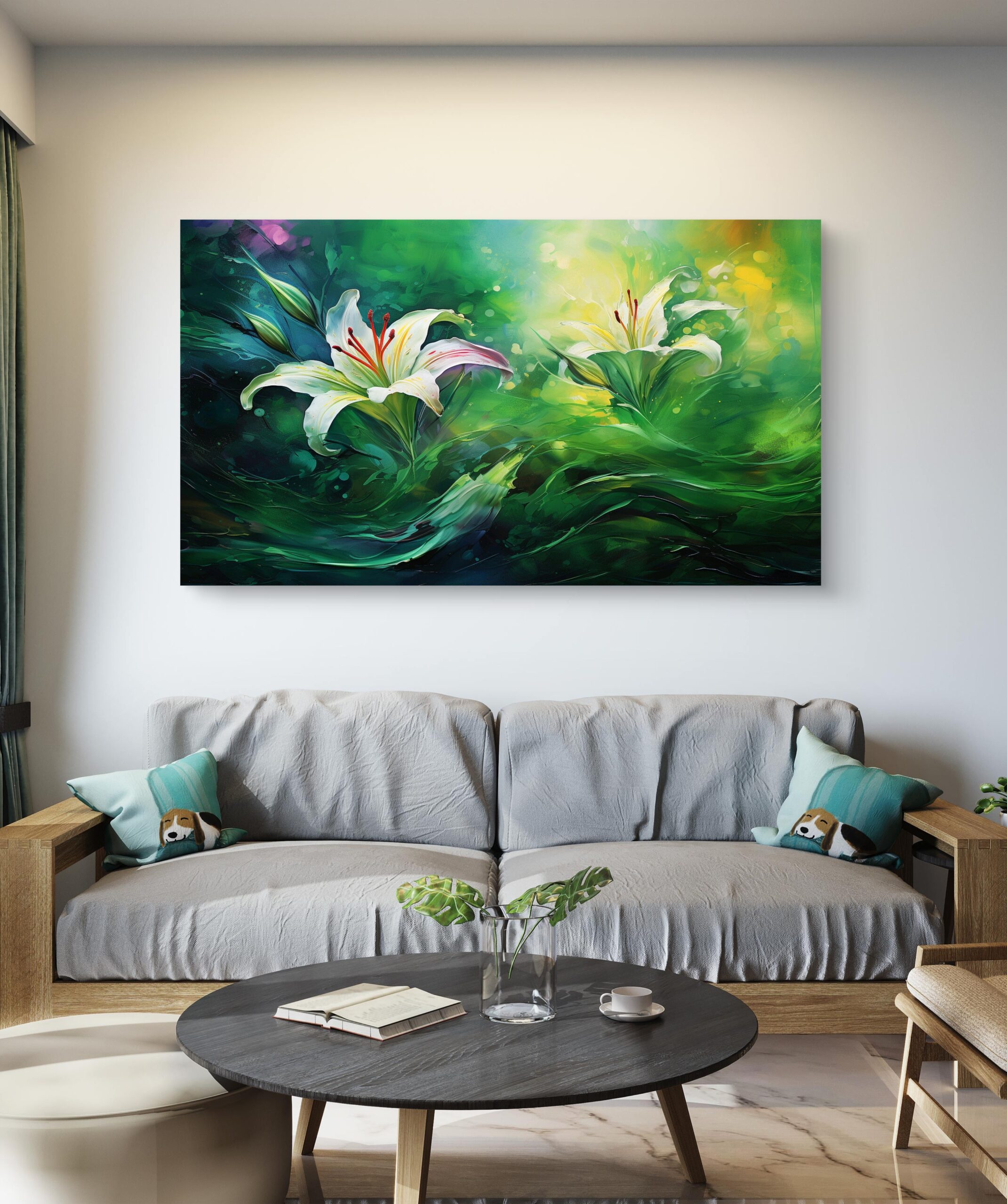 Plongez dans un monde de calme et de beauté avec Sérénité Florale, une œuvre lumineuse mettant en scène deux lys majestueux flottant dans un tourbillon de vert et de lumière. Ce tableau incarne l’harmonie entre la nature et l’émotion, avec des couleurs éclatantes qui apportent fraîcheur et douceur à n’importe quel intérieur. Idéal pour créer une atmosphère apaisante dans un salon, une chambre ou un espace de détente.