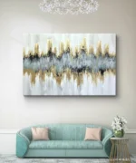 atmosphère calme et sophistiquée. Les touches d’or texturées se mêlent à des nuances profondes de gris et de bleu, créant un contraste harmonieux sur un fond clair et apaisant.