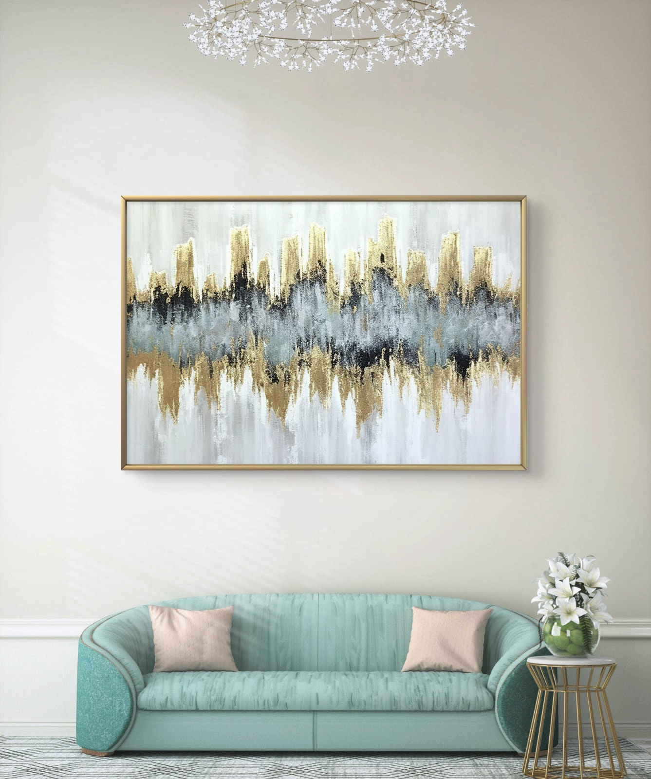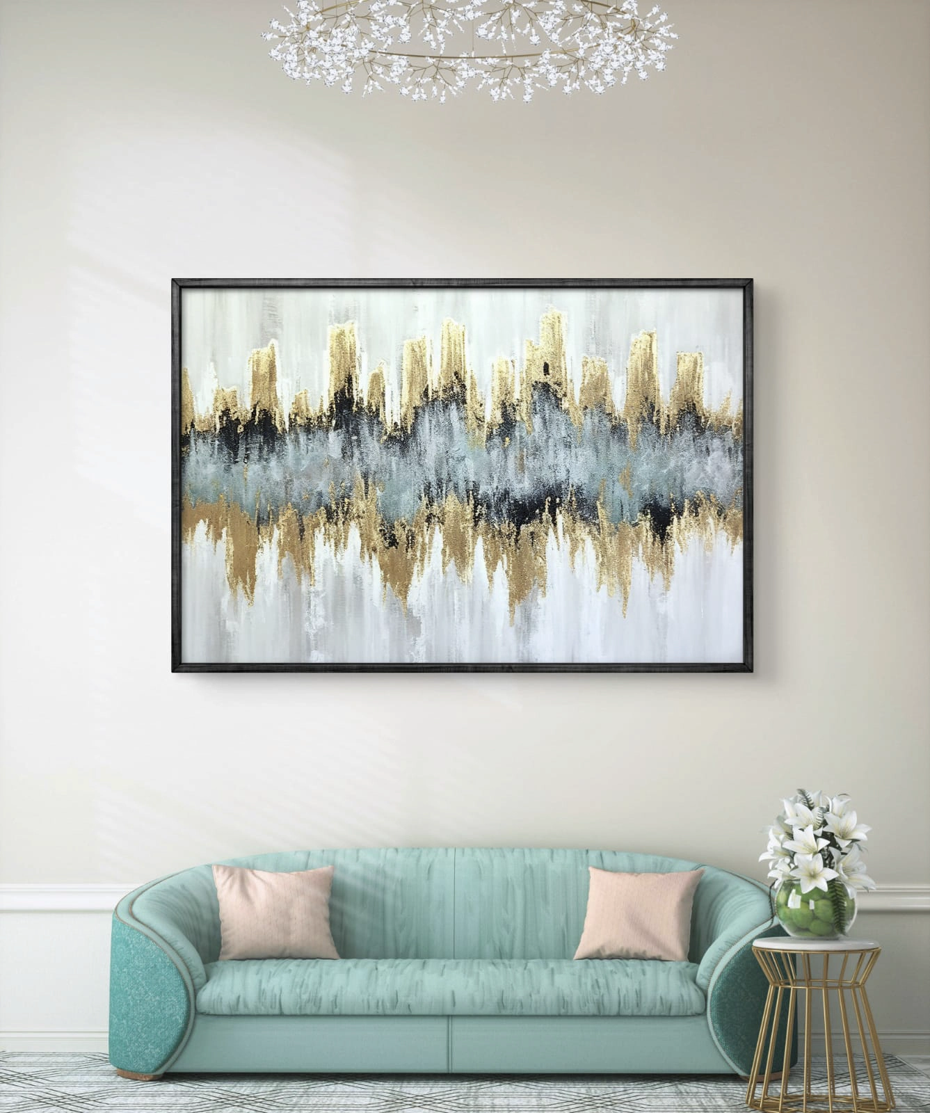 Le reflet inversé donne au tableau une sensation de symétrie et de profondeur, comme une ville silencieuse se mirant dans une eau immobile. Parfait pour sublimer un espace moderne, ce tableau apporte élégance, sérénité et caractère à votre intérieur.