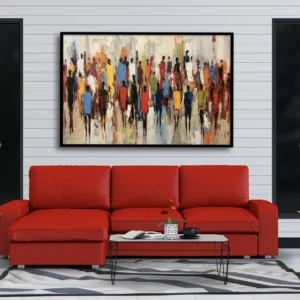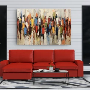 “La Marche des Couleurs” est une œuvre expressive et pleine de mouvement, représentant une foule de silhouettes humaines aux vêtements