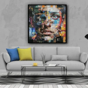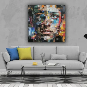 Un portrait moderne et saisissant, composé de touches géométriques éclatées et de couleurs vibrantes. Ce tableau fusionne art abstrait et