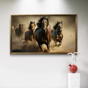 Plongez dans la puissance et la liberté avec Élan Sauvage, une œuvre d’art vibrante représentant un cheval majestueux lancé à