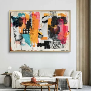 Plongez dans l’émotion et la modernité avec Visages en Fusion, une œuvre contemporaine mêlant esquisses expressives et éclats de couleurs