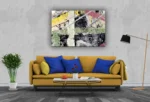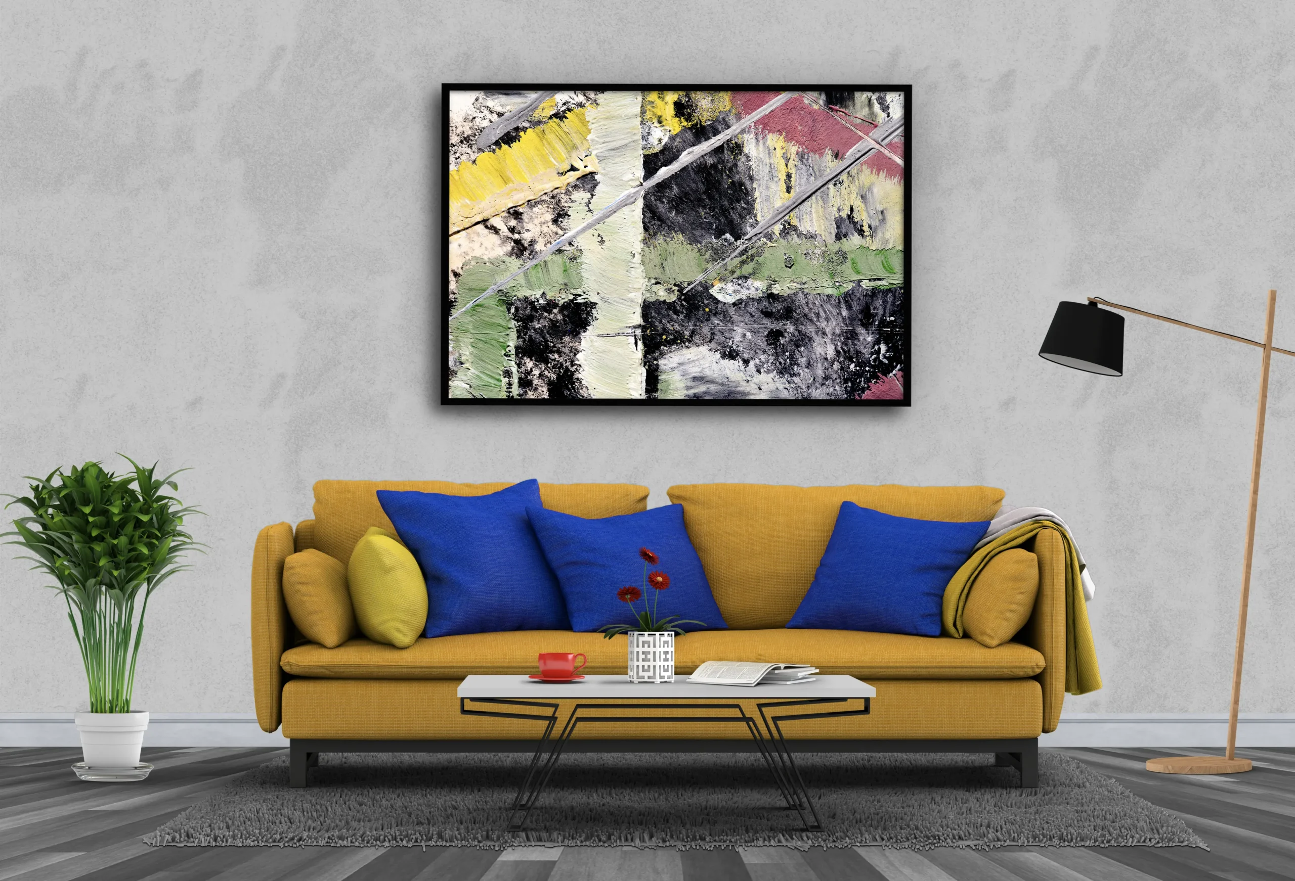 Une toile abstraite aux formes géométriques et aux textures marquées, mêlant des teintes de jaune, vert, noir et bordeaux. L’œuvre évoque une énergie brute et urbaine, parfaite pour apporter du caractère à un espace moderne.