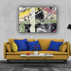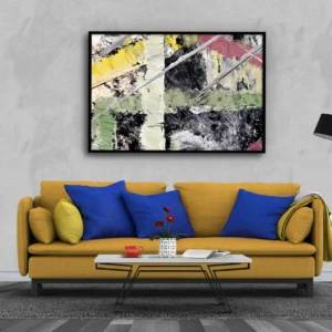 Une toile abstraite aux formes géométriques et aux textures marquées, mêlant des teintes de jaune, vert, noir et bordeaux. L’œuvre