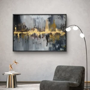 Reflets Dorés capture l’élégance d’un horizon abstrait où les tons gris et bleus se mêlent à une touche d’or éclatante.