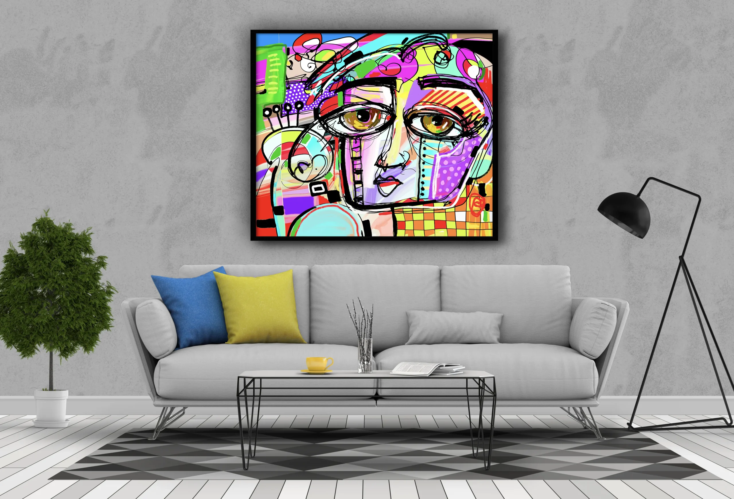 Un tableau moderne inspiré du style pop art, représentant un visage expressif aux lignes noires audacieuses et aux couleurs vives comme le vert fluo, violet, rose et jaune. Ce mélange de formes géométriques et de textures graphiques donne à l’œuvre une énergie ludique et contemporaine. Parfaite pour un intérieur jeune, créatif et plein de peps.