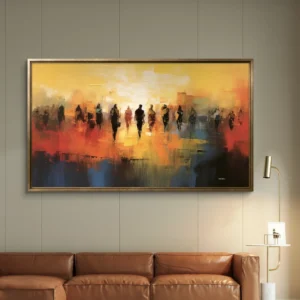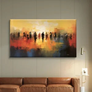 Silhouettes au Crépuscule est une œuvre abstraite pleine de vie et d’émotion. À travers un jeu de couleurs chaudes —