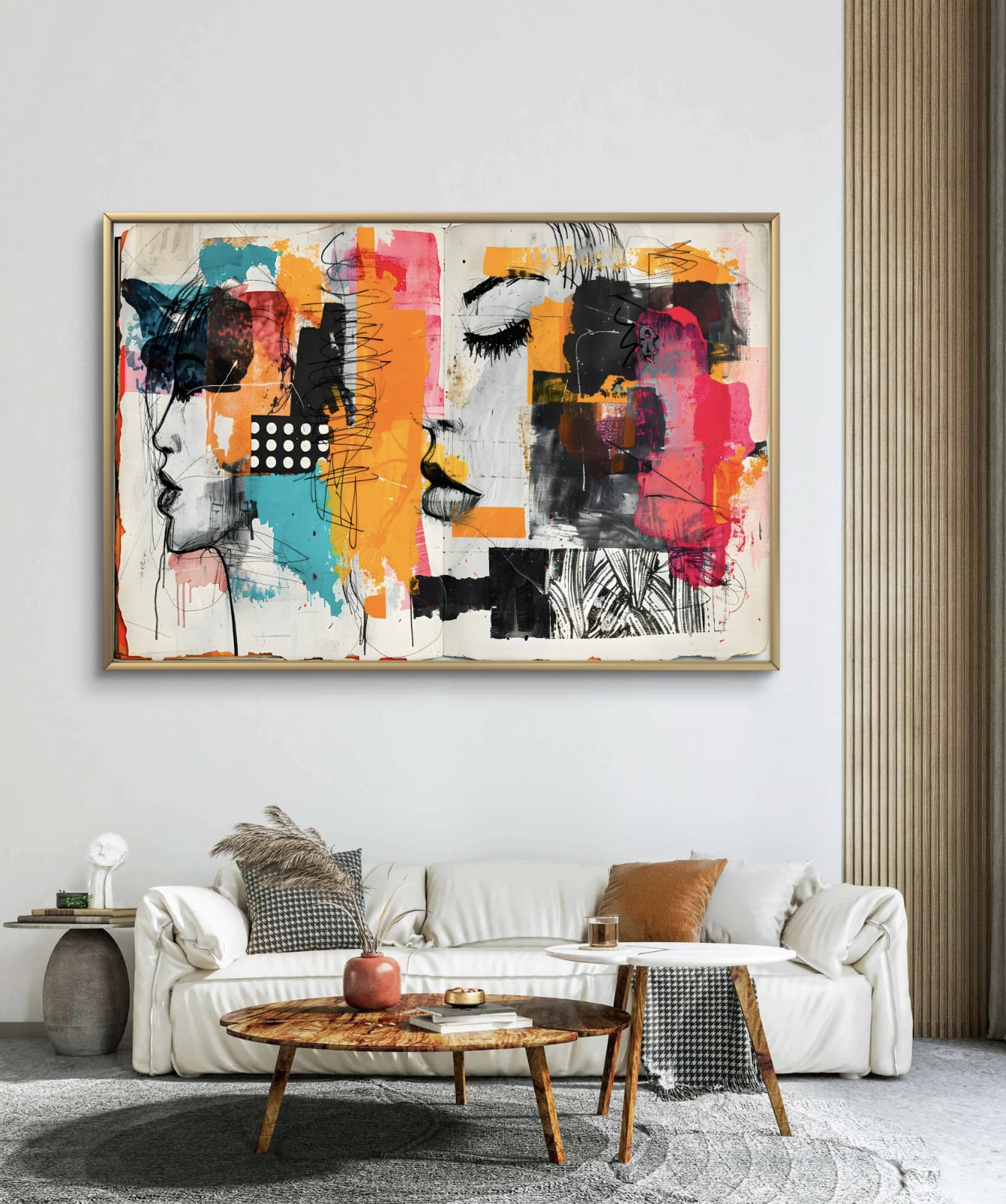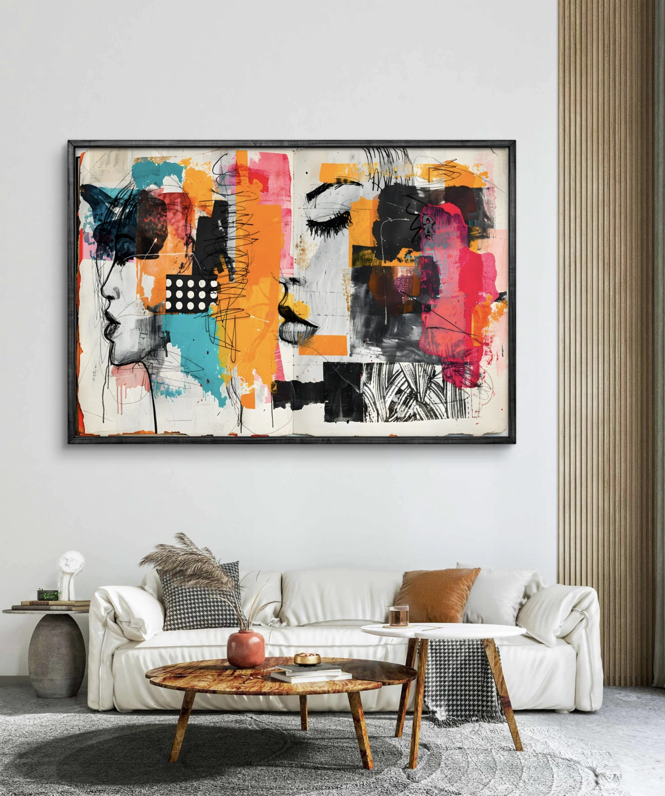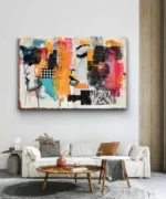 Plongez dans l’émotion et la modernité avec Visages en Fusion, une œuvre contemporaine mêlant esquisses expressives et éclats de couleurs vives. Les teintes orange, turquoise, rose et noir s’entrelacent dans une composition abstraite où deux visages se devinent, évoquant la dualité entre rêve et réalité.